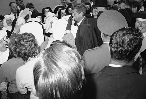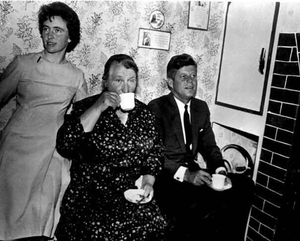 U.S. President John F. Kennedy meets with his Irish cousins in the barnyard of their mutual forefather's homestead, at Dunganstown, June 27, 1963. AP Photo