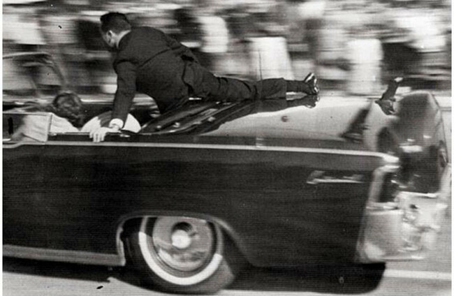 Clint Hill jumping on the limousine as Kennedy came under attack. Alamy Stock Photo