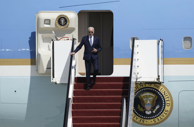 US President Joe Biden walks down the steps of Air Force One upon his arrival at Ben Gurion International Airport. AP/PA Images