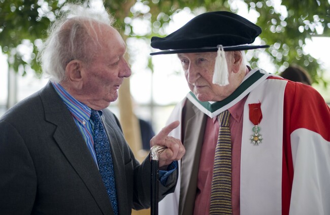 John Montague (right) prior to the Bloomsday conferral ceremony where he was awarded an Honorary Degree of Doctor of Literature at UCD. Leon Farrell/Photocall Ireland