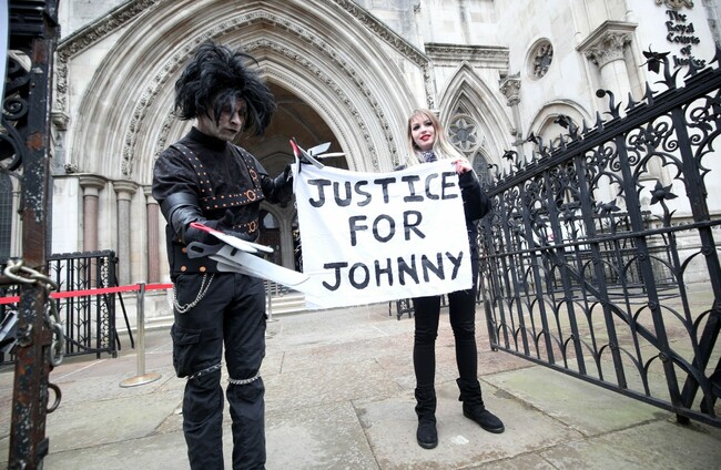 Supporters of Johnny Depp outside the Royal Courts of Justice in London today.