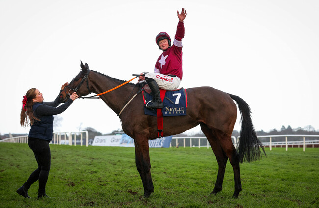 Sam Ewing onboard Brighterdaysahead celebrates winning The Neville Hotels Hurdle (Grade 1). Ryan Byrne/INPHO