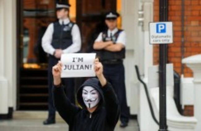 A masked supporter of Julian Assange outside the Embassy of Ecuador in London this afternoon Dominic Lipinski/PA Wire