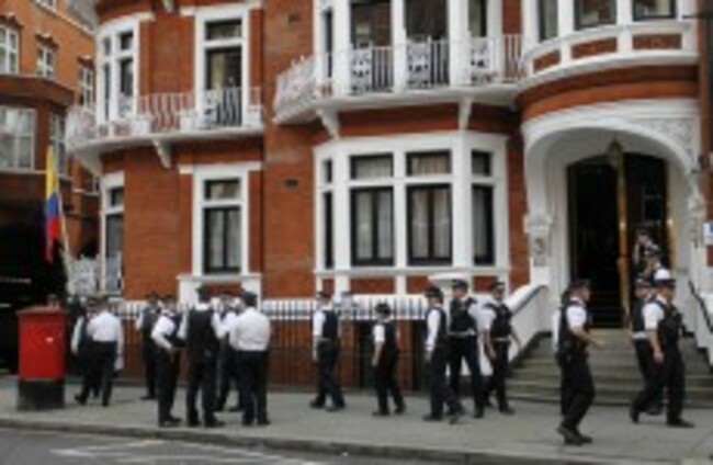 Police patrol outside the Ecuadorian embassy in Knightsbridge, where Julian Assange is inside - having been granted political asylum by Ecuador while remaining wanted by Britain for extradition. AP Photo/Sang Tan