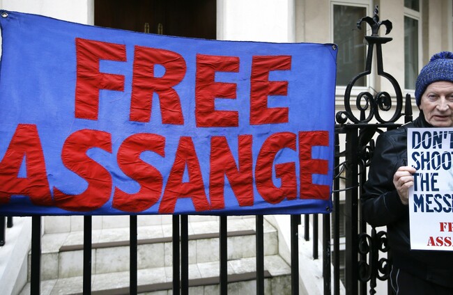 A demonstrator holds a banner outside the Ecuadorean Embassy in London. AP/Press Association Images