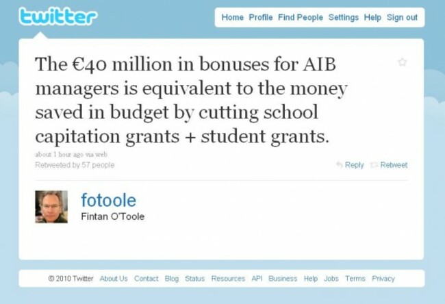 Commentator Fintan O’Toole pointed out on his Twitter account this morning that the €40m being paid in bonuses to the AIB workers is equivalent to the amount saved in the Budget by cutting school capitation grants and student grants: