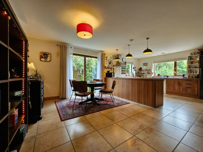 The kitchen and dining area form the heart of the home, designed for both family meals and entertainment. An island unit, double oven, tiled splashbacks and extensive storage add to the room’s practicality. The adjoining utility room offers more storage and easy access to the back garden.
