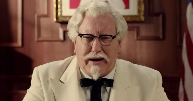 Complete with banjo music and a slightly wheezing cackle, the world’s most famous chicken salesman was rolled out again for this “state of Kentucky Fried Chicken address”:
