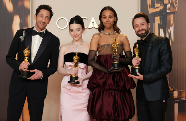 Adrien Brody, Mikey Madison, Zoe Saldana and Kieran Culkin with their Oscars. Alamy Stock Photo