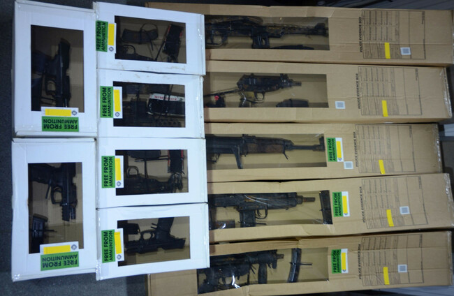 They contained seven machine guns, three automatic hand guns, an assault rifle and ammunition.