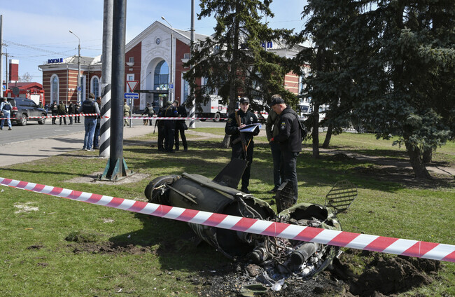 Ukrainian servicemen stand next to a fragment of a Tochka-U missile after Russian shelling at the railway station. Andriy Andriyenko