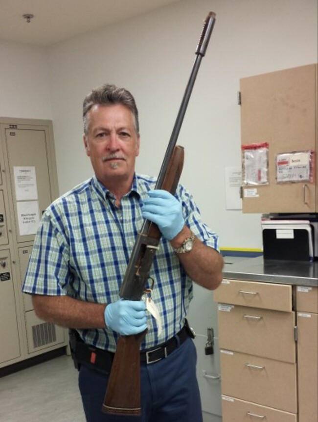 Detective Michael Ciesynski holds the shotgun which rock legend Kurt Cobain used to take his own life in 1994. AP