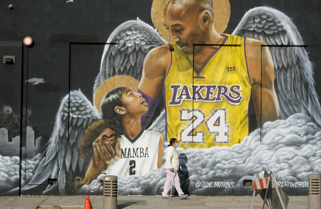 A pedestrian walks past a mural of the late basketball star Kobe Bryant and his daughter Gianna in downtown LA. Ringo Chiu