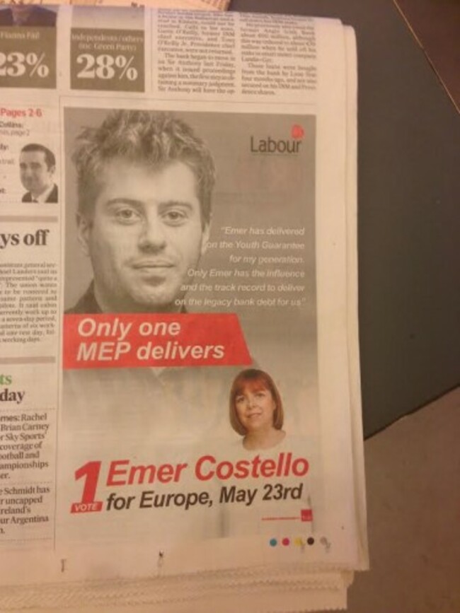 A FRESH-FACED YOUNG man appears on the front page of today’s Irish Times offering his full support to Labour MEP Emer Costello in her bid to retain a seat in Brussels.