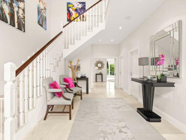 The property showcases a striking blend of tradition and innovation. A tree-lined avenue, framed by newly installed electric gates, leads to the home’s stately façade, where ivy-draped gables and symmetrical bay windows nod to the grandeur of a bygone era. Inside, however, is a different story – one of soaring spaces, cutting-edge comfort and effortless flow.