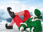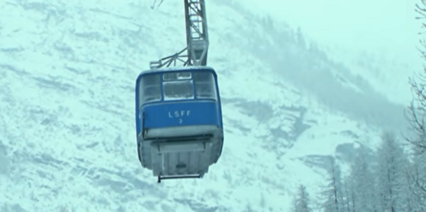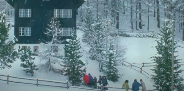 Before they get on the ski lift to their snowy chalet, George meets the woman he gave his heart to last Christmas. What colour coat is she wearing?