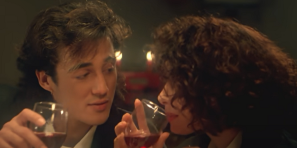 After George and his former lover share wistful glances over dinner, the camera zooms in on something worn by her new beau (Andrew Ridgeley) - what is it?