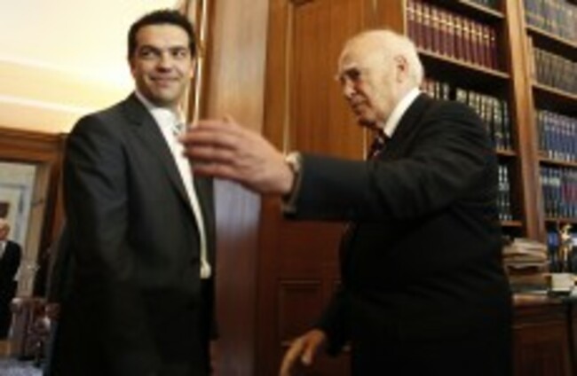 President Karolos Papoulias, right, meets with Syriza leader Alexis Tsipras earlier this week. Papoulias will meet Tsipras again today, as well as the leaders of the two pro-bailout parties, to try and form a unity government. Kostas Tsironis/AP