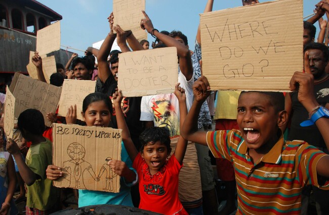 File image: Sri Lankan asylum seekers who were caught in Indonesian waters while trying to sail to Australia hold up posters during a demonstration. Associated Press