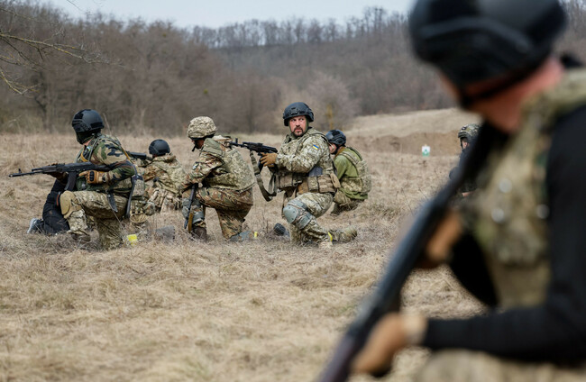 Recruits of the Steel Border storm brigade practise at the unit's base in central Ukraine on 24 March, 2023.