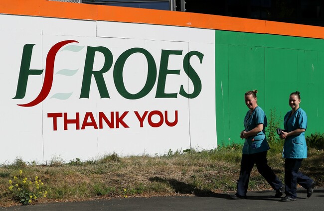 Linda Rochford (left) and Sophia Kelly, who work in catering at St James's Hospital, pass a mural thanking HSE workers. PA