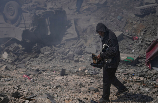 A man carries shoes from his destroyed house that was hit by Israeli airstrikes in Sir al-Gharbiyeh village, south Lebanon. Alamy Stock Photo
