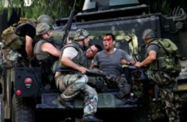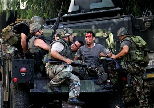 Lebanese army soldiers help injured soldiers after clashes between followers of a radical Sunni cleric Sheik Ahmad al-Assir and Shiite gunmen, in the southern port city of Sidon, Lebanon today. (AP Photo/Mohammed Zaatari)