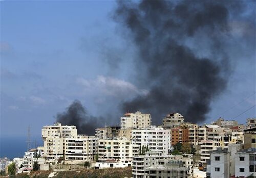 Black smoke rise from a burning house that was attacked during clashes that erupted between followers of a radical Sunni cleric Sheik Ahmad al-Assir and Shiite gunmen in the southern port city of Sidon, Lebanon. (AP Photo/Bilal Hussein)