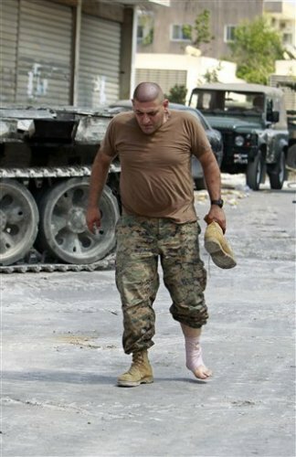 An injured Lebanese army solder walks in Sidon, Lebanon. (AP Photo/Bilal Hussein)