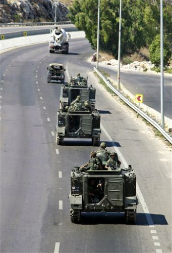 A convoy of Lebanese army vehicles move toward the site of clashes between followers of a radical Sunni cleric Sheik Ahmad al-Assir and Shiite gunmen in Sidon, Lebanon(AP Photo/Bilal Hussein)