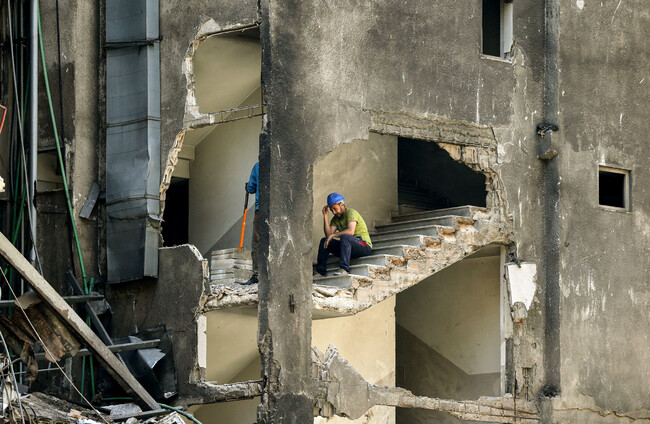 Labourers work on reconstructing part of a devastated building that was heavily damaged in a massive Israeli air strike in Beirut, 8 April. ZUMA Press, Inc./Alamy Live News