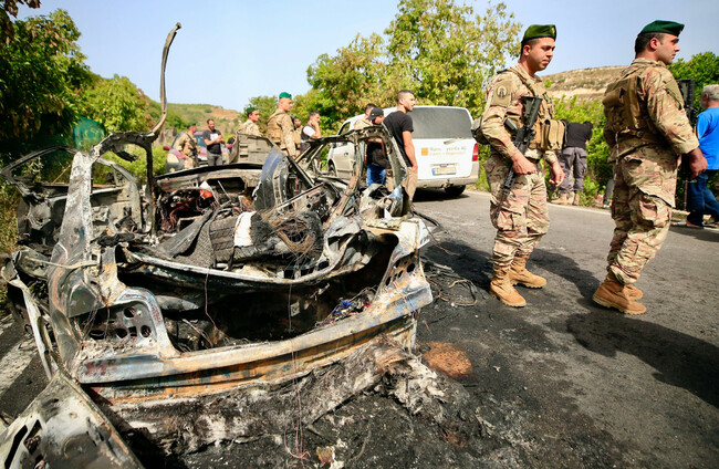 Wreckage of a car that was bombed by an Israeli drone in Mazraat Jemjim, Lebanon on 17 May 2025. Alamy Stock Photo