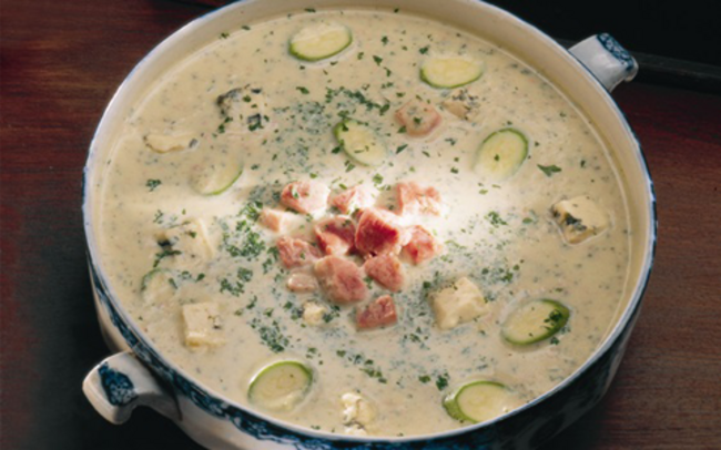 This bacon, courgette and Cashel Blue soup recipe uses bacon lardons but we think you could substitute some leftover ham in there very easily and have it be just as tasty.