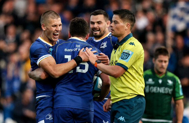 Jimmy O'Brien celebrates with Sam Prendergast and Max Deegan after Leinster's fifth try. Ben Brady/INPHO