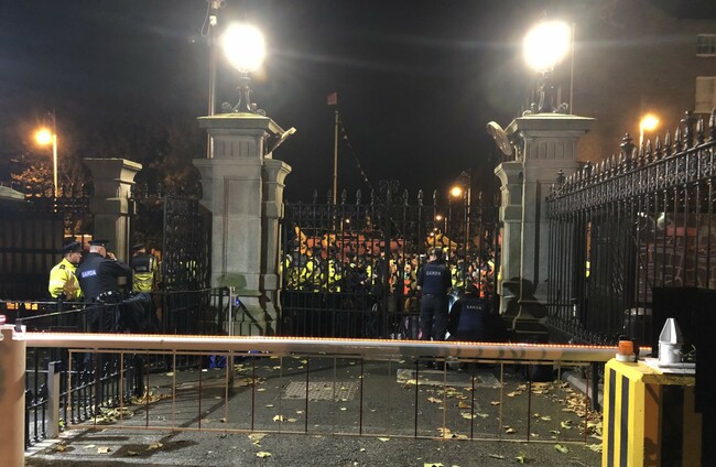 Five protesters were arrested last night after chaining themselves outside the gates of Leinster House, preventing around 15 staff from exiting the building, including TDs Alan Farrell and Michael Fitzmaurice.