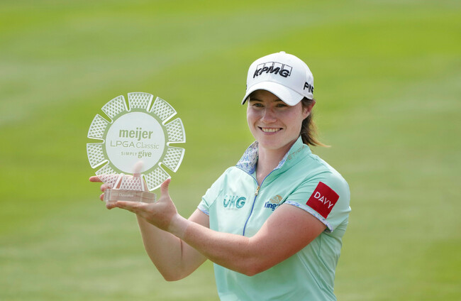 Leona Maguire holds the winner's trophy after the final round of the Meijer LPGA Classic golf tournament. Alamy Stock Photo