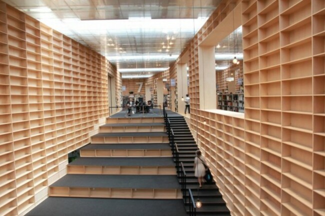 Japanese architect Sou Fujimoto designed the library to be the simplest library in the world, made from only bookcases and a glass exterior. The 20-foot high walls are made from bookshelves, and are only interrupted by bridge-like reading areas.