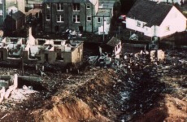 Wrecked houses and a deep gash in the ground in the village of Lockerbie, Scotland - damage caused by the crash of Pan Am Flight 103 Dec. 21, 1988. AP Photo/Martin Cleaver, File