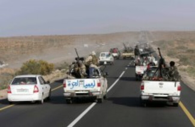 Rebel vehicles hit the road out of Ras Lanouf on the way to Sirte, home town of Muammar Gaddafi. STR/AP