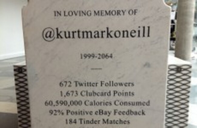 The macabre grave-marker lists your vital statistics on various social networks (and your clubcard data too) at the exact time you slipped the mortal coil.