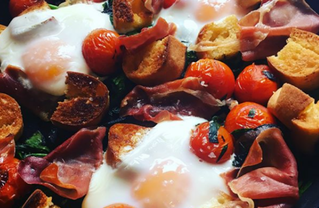 4. One-pan eggy brunch: This is a lovely lazy weekend brunch. I make gluten-free croutons first, then add tomatoes and mushrooms to the pan followed by spinach and Parma ham. Finally crack in the eggs then add the croutons back to the pan. Finish under the grill. Everything you need for a delicious brunch in one pan!