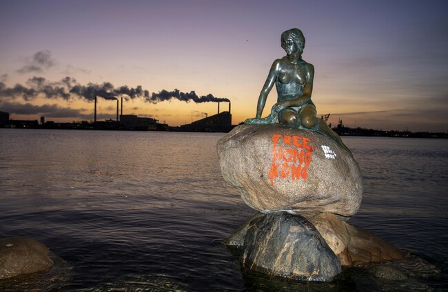 Three lines in red, reading Free Hong-Kong, were painted on the rock in Denmark on which the bronze sits, next to the same text in white.
