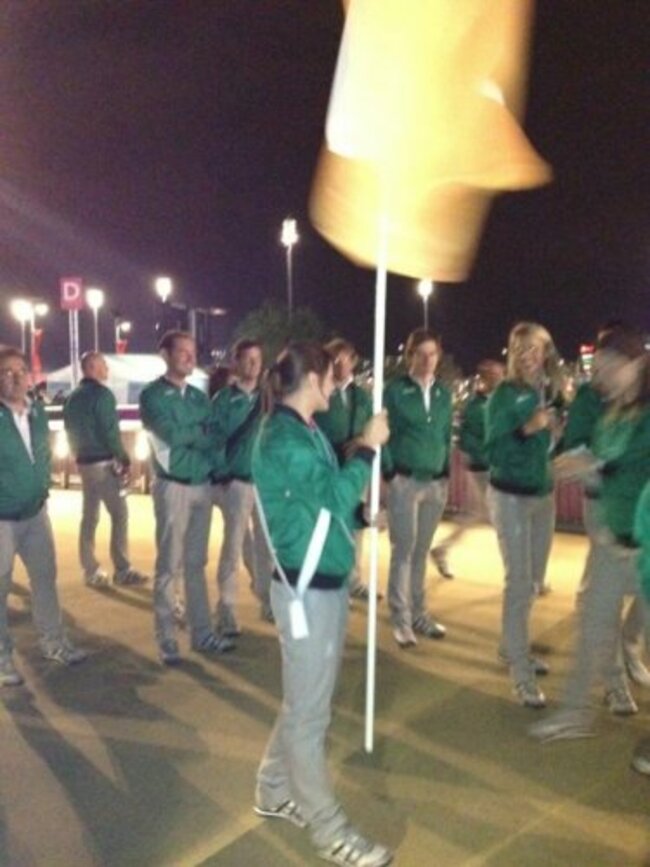 1135 Ireland’s hope in the pentathlon has tweeted a couple of nice, little images. Katie with the flag behind the scenes and then emerging into the arena.
