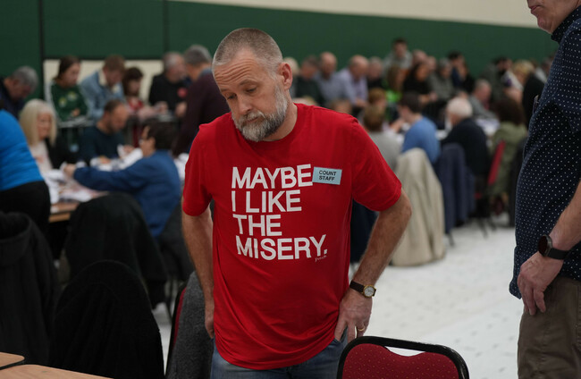 A member of the count staff at Nemo Rangers GAA Club in Cork, where counting has now ended for the night. Alamy Stock Photo