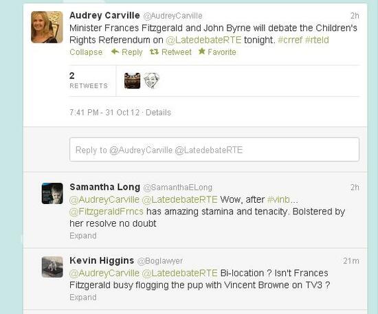 There has been a little confusion on the Tweet Machine, as our #vinb would call it, as to how Children’s Minister Frances Fitzgerald will make it to RTÉ in time for the Late Debate radio show on RTÉ Radio 1 tonight. Well we can *reveal (*well, TV3 openly say so) that the TV3 debate went ahead one hour ago and is being shown as a pre-record. But as it’s only an hour ago, we’ll go with the ‘almost live’ tag.