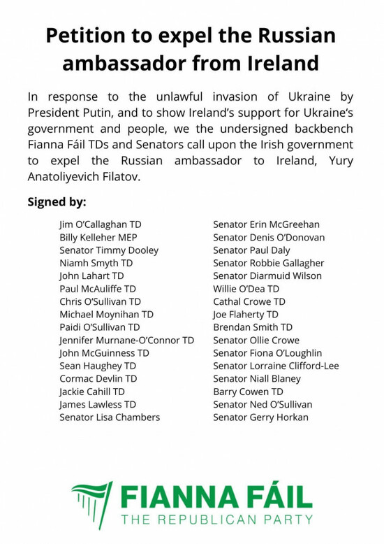 Fianna Fáil’s backbench Oireachtas members have signed a petition seeking the expulsion of the Russian ambassador Yury Filatov.