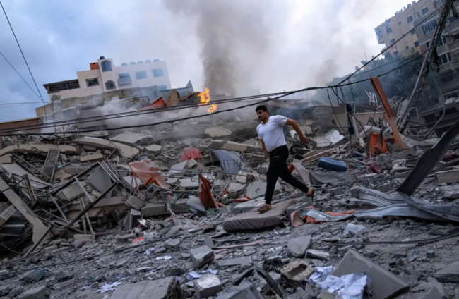 Palestinians walk amid the rubble following Israeli airstrikes that razed swaths of a neighbourhood in Gaza City AP Photo/Fatima Shbair/PA Images