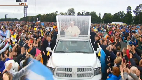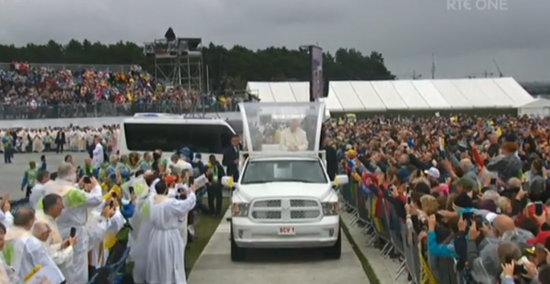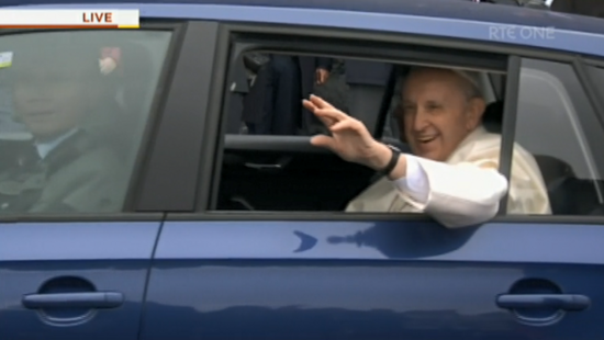 The pope is back in his Skoda, windows down, on his way back to the airport. He is a little behind schedule for this flight back to Dublin.
