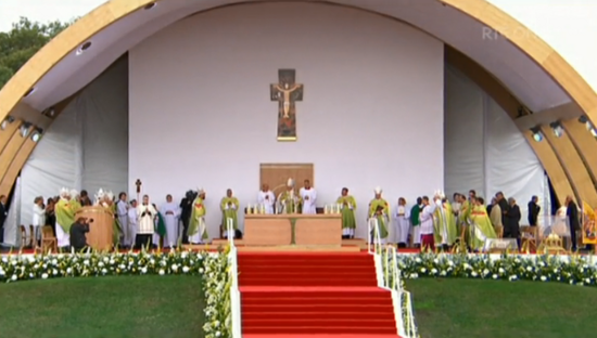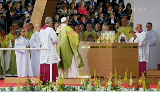 Large cheers from the congregation at the Phoenix Park at the first sight of the pontiff on the altar: