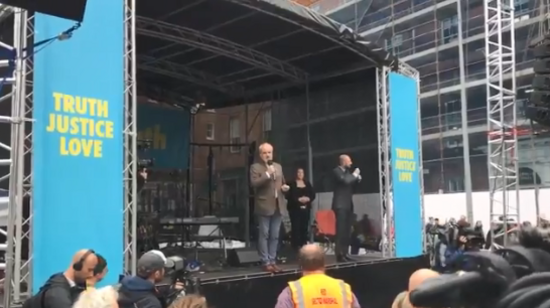 Following a song by Mry Coughlan – Magdelene Laundry – Brian Kennedy took to the stage, encouraging the crowd to chant “truth, justice and love”.